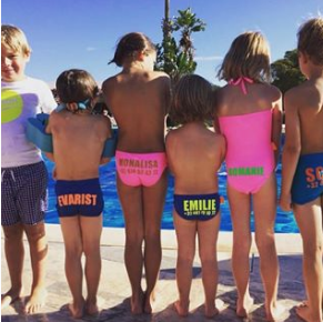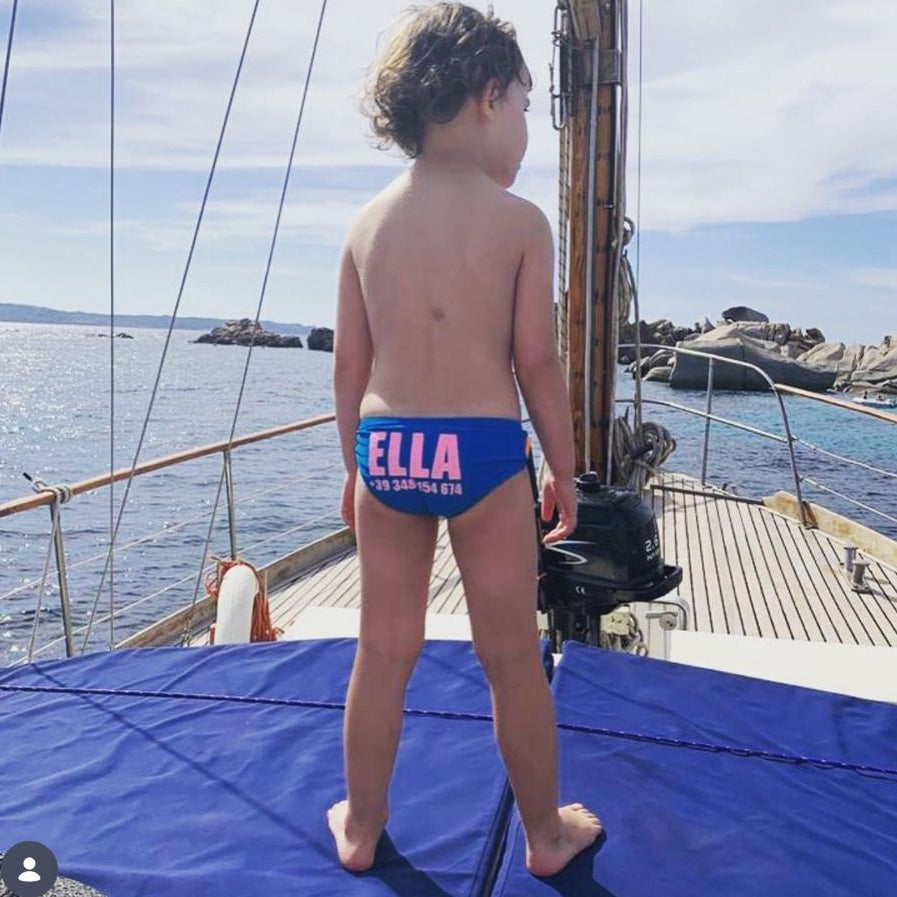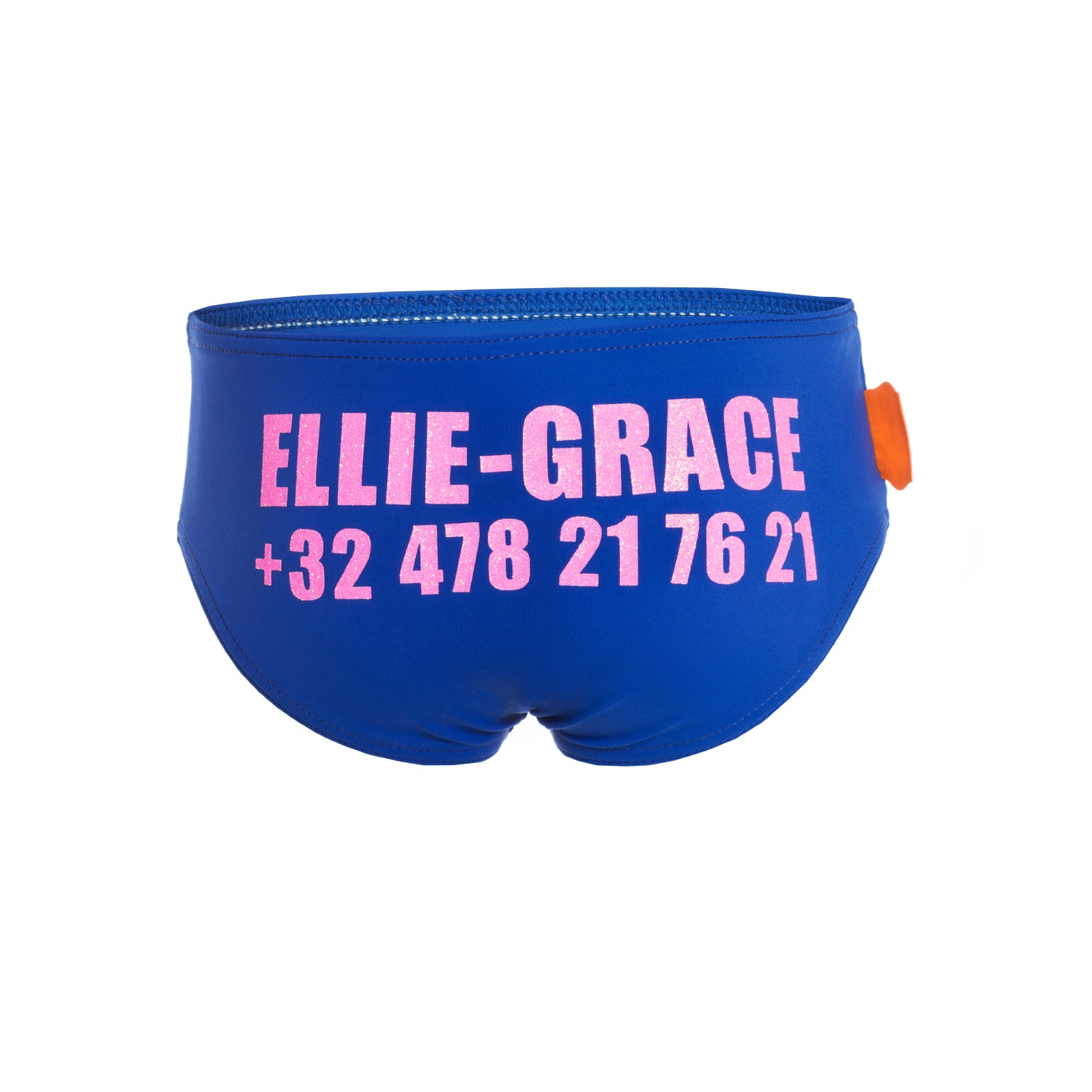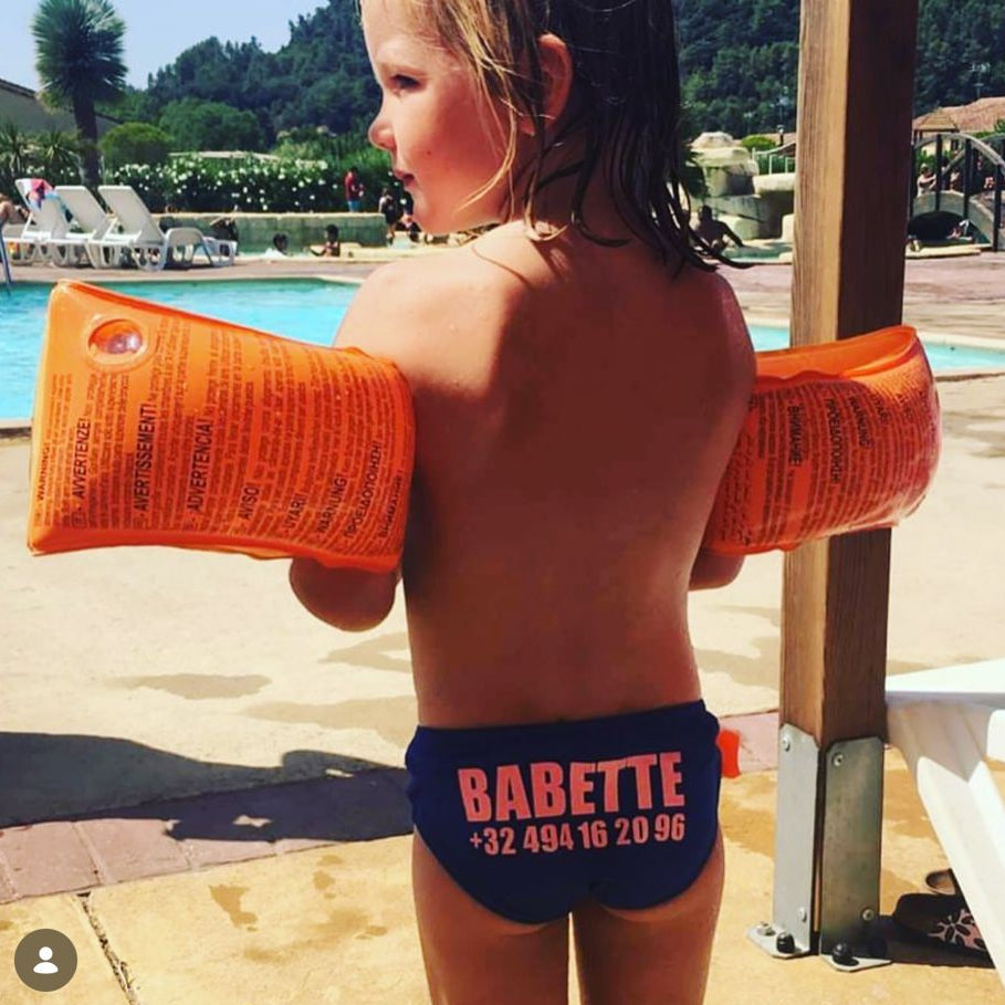 gepersonaliseerd zwemslipje met naam en telefoonnummer.